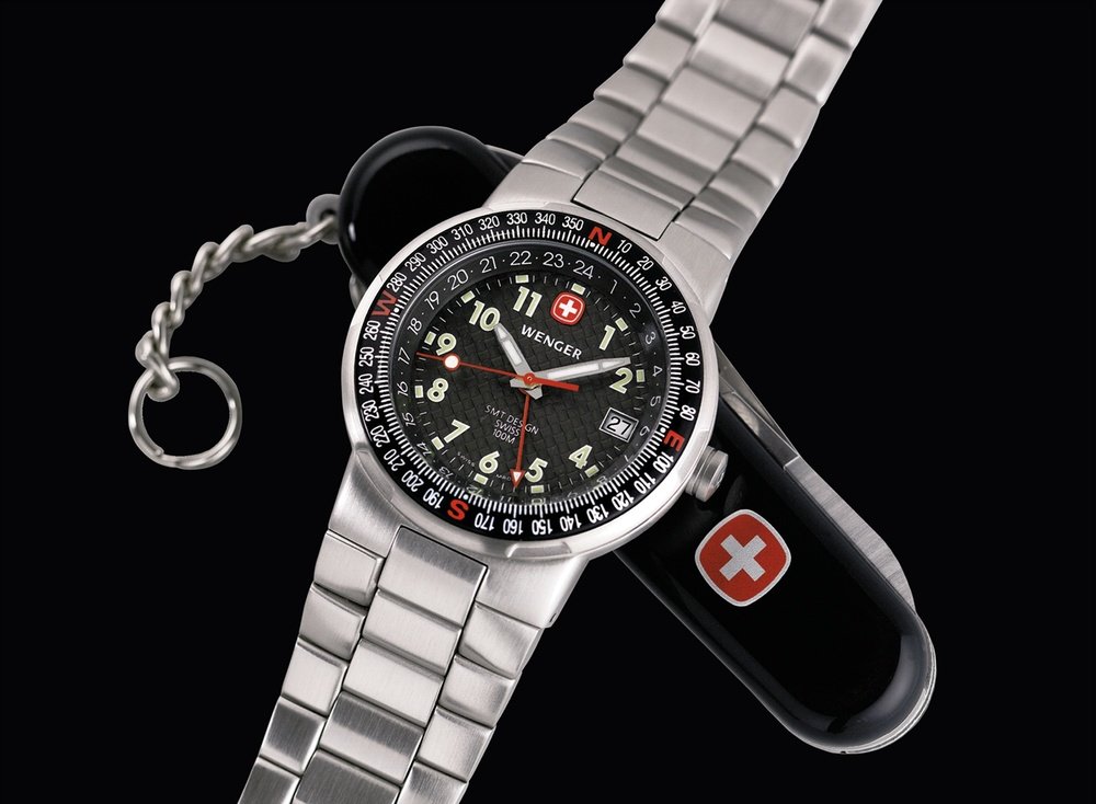 Brigade Air is a new chic, sporty line from Wenger, manufacturers of the famous Swiss army knife. In a steel case with a unidirectional rotating bezel marked with 360 degree gradations, it is equipped with a quartz movement with both a 12 and 24-hour display, which will also permit a second time zone to be read off. In a ladies’ and men’s size, the watch is available on a bracelet in steel, leather or rubber and, in the ladies’ size only, on a red or blue leather bracelet.