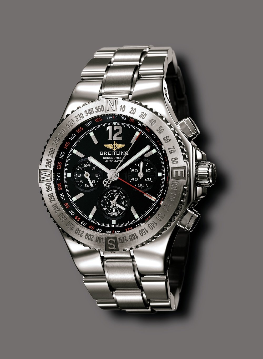 Despite its build - 44,8 mm in diameter and 15,7 mm thick - the biggest ever achieved by Breitling, the Hercules automatic chronograph fits even the most slender of wrists. On the performance side, it benefits from exceptional legibility: a double display of the times measured, with a 60 min central totaliser plus a linked hours and minutes totaliser at 6 o’clock, distinguishing between times smaller than and greater than 1h. It additionally includes a 24 h display, an IFR/VFR flight level indicator and a bidirectional bezel with degrees and compass rose.