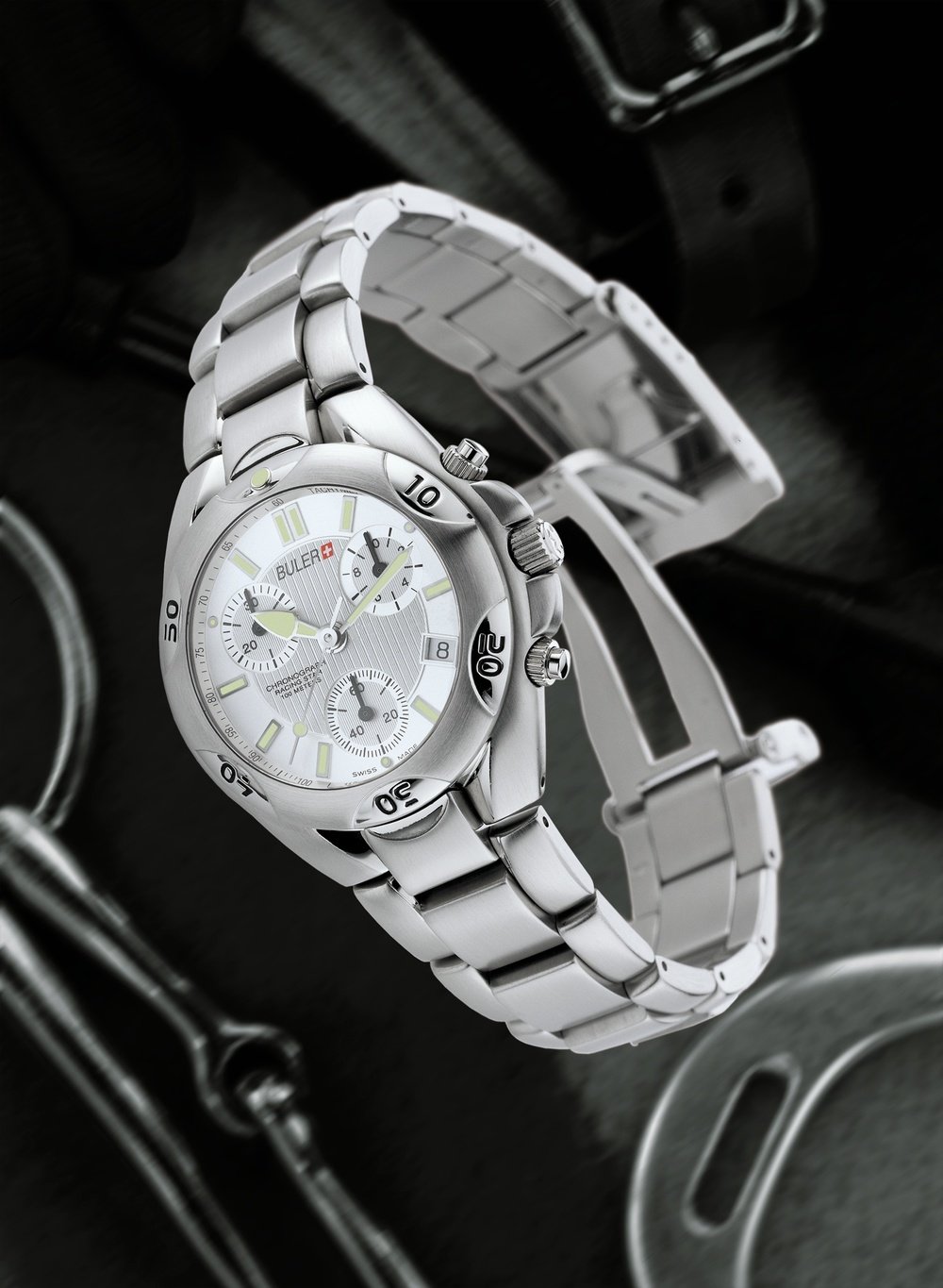 Housed in steel, with alternating polished and satin surfaces, the new Buler chronograph has minute and tenth-of-a-second counters. The dials in a range of colours and finishes, with one version in carbon fibre, come with large, luminescent hands and hour-markers to ensure optimum legibility down to a depth of 100 metres.