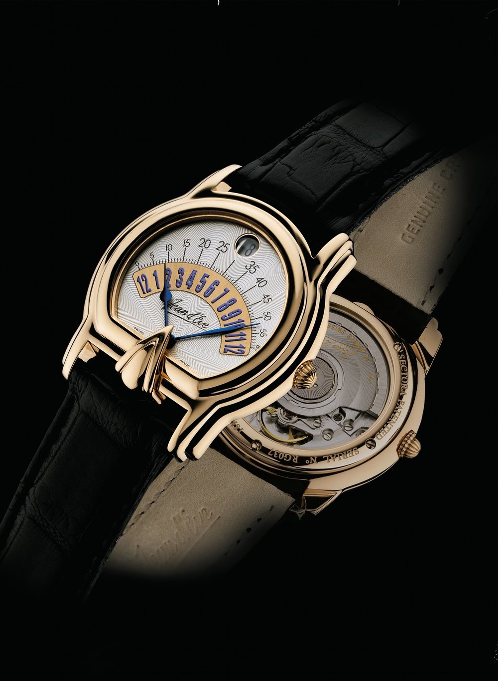 For 2001, the Sectora, whose distinguishing feature is its display of the time over an angle of 120 degrees, boasts a new engine-turned dial and comes housed in a case of solid yellow, red or white gold. The automatic movement, with Côtes de Genève decoration, can be admired through the back of its case.