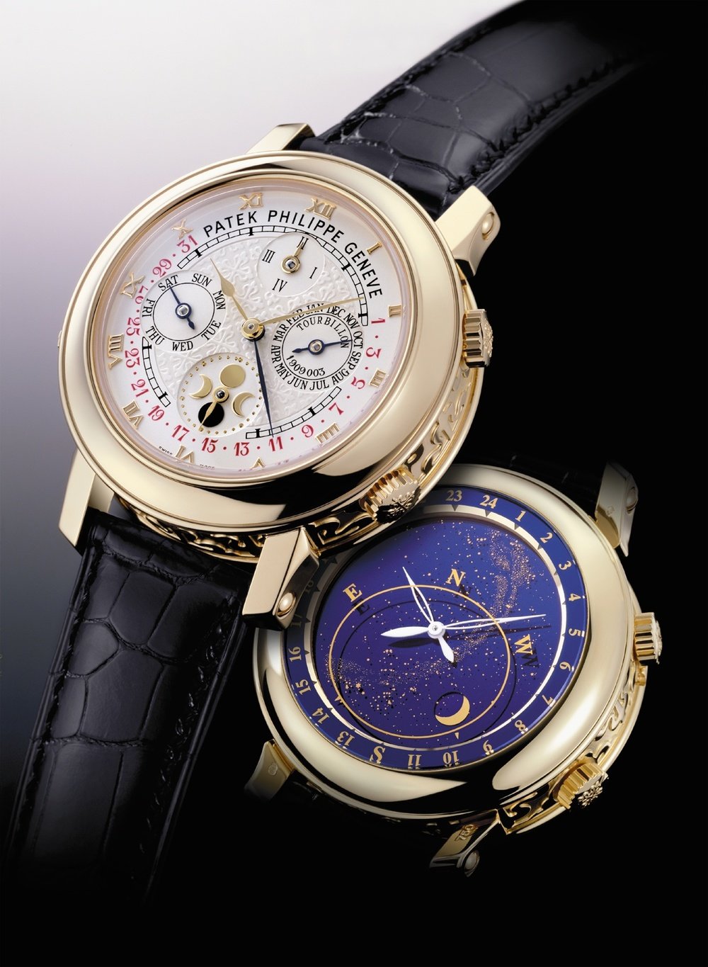 The Sky Moon Tourbillon has two fascinating faces - one towards the dial showing mean solar time and a perpetual date, and the other on the base with a map of the night sky, the angular movement of the moon, the moon phases and sidereal time. This is not only the most complicated wristwatch currently produced by Patek Philippe but also the first double-face wristwatch to be produced in the entire history of Geneva watchmaking. It incorporates 12 complications. The mechanical module for the astronomical indications on the sky-side dial has been awarded a Swiss patent.