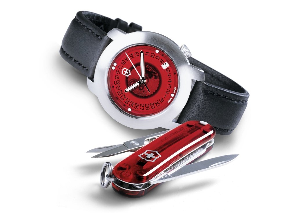 Victorinox is indulging in colour, transparency and originality in setting out the design of one of its latest pocket knives on a sporty watch. The shiny dial in a synthetic material contrasts with the satin-finish steel of the cambered bezel, discreetly revealing the date disc and the central part of the movement. A new symbol of Swiss quality, both in the pocket and on the wrist.