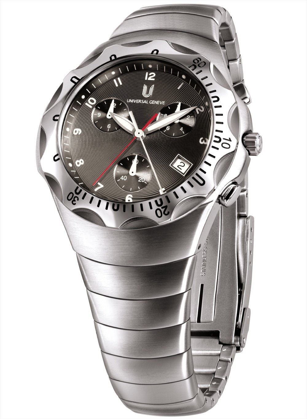Under the heading “Time for change”, Universal Genève is giving a new lease of life to its tradition by launching a number of models for the dynamic, modern youth of today. One example is the Master Compax Vortex, a chronograph with a sporty and elegant design which incorporates an ultra-high-performance quartz movement with split-seconds. A fine interplay of curves and an avant-garde vision.