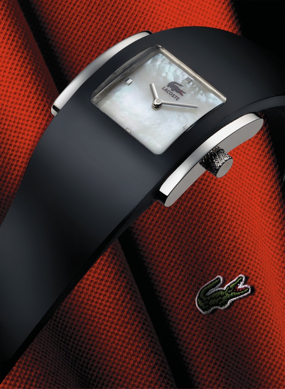 Lacoste is going up to the net with a new watch in a truly original design. Its curved, rectangular case is “captured” in a large, single-piece rubber bracelet which holds it at both the top and the bottom. The dial in natural mother-of-pearl adds a feminine touch. The true innovation for the wrist.