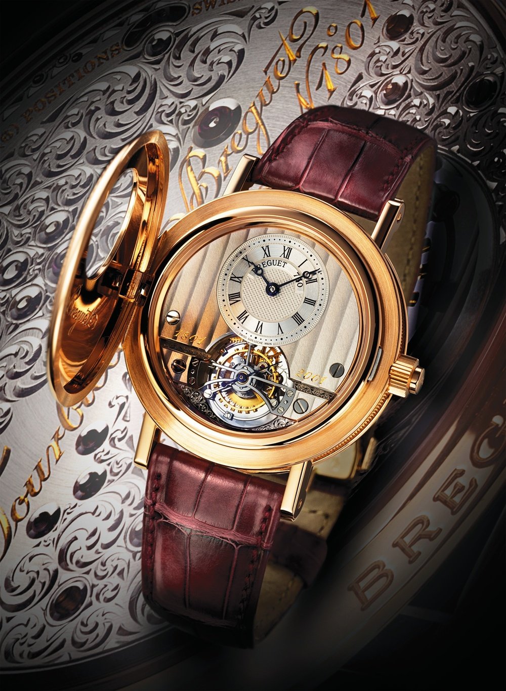 This model has been manufactured in honour of the most famous invention of Abraham-Louis Breguet - the tourbillon - discreetly hidden behind an engine-turned cover. The fluted case is in 18-carat pink gold. The hour dial with its distinctive decoration can be seen through the opening on the cover. The movement, a true example of fine watchmaking, is visible through the sapphire crystal back.