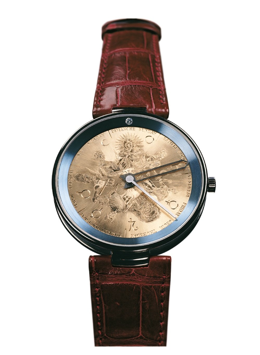 This unique creation has been given a unique dial, hand-engraved on a solid gold plate. The primary purpose is to display the seven days of the week as they glide past the diamond placed at 12 o’clock. The cultural inspiration is drawn from mythology and its pantheon of divinities. From Sunday to Saturday: Helios, the sun god; Selena, the moon goddess; Mars, the god of war; Mercury; the traveller’s guide; Jupiter, ruler of the heavens; Venus, goddess of love; and finally Saturn, the god of agriculture.