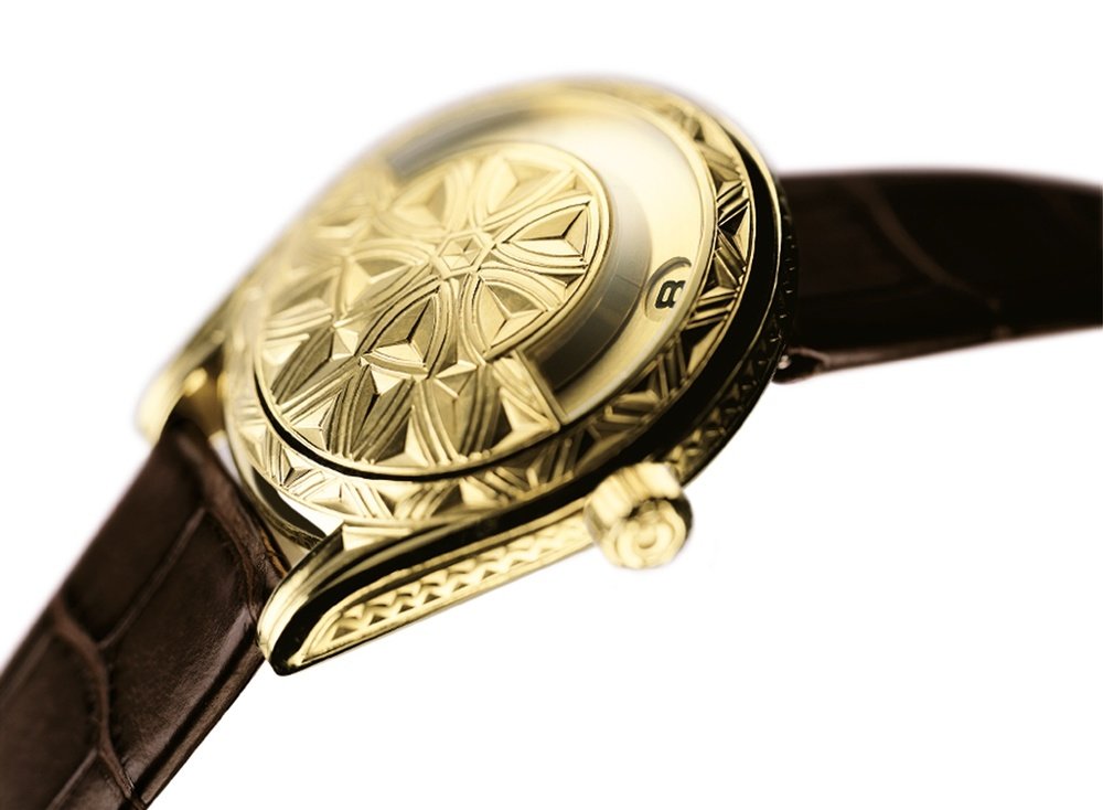 This creation, stemming from the fertile imagination of designer Martin Frei and developed by Felix & Thomas Baumgartner, is sculpted from a single block of solid gold and enriched by an exclusive hand-engraving. It houses a self-winding movement equipped with two discs that are pivoted at the far ends of a revolving bar and mounted on a Maltese cross to avoid any friction.