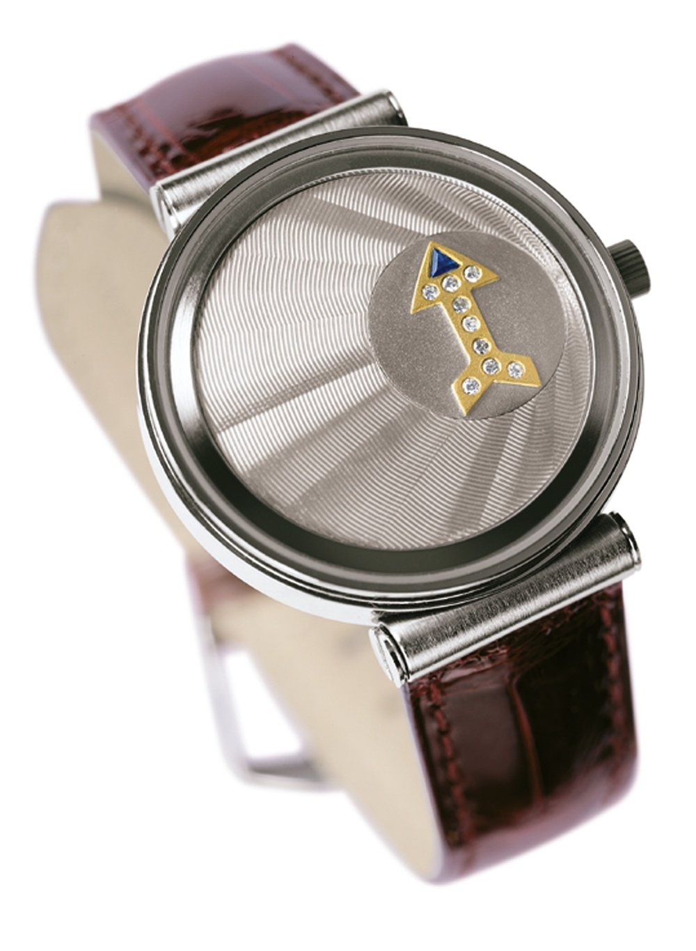 The creation by Bernhard Lederer is a genuine stylistic composition. On the front, the hour is represented by the point of convergence of the guilloché waves on the large solid silver turning dial, while the minutes are read off at the tip of the arrow on a rotating subdial. Thus freed from any form of conventional indication, whether numerals, hour-markers or hands, the space available lends itself to absolute personalisation. For Goldpfeil, the golden arrow adopts the brand’s hallmark shape and reigns supreme, set with nine diamonds and one sapphire, on a silvered background matching the white gold of the case.