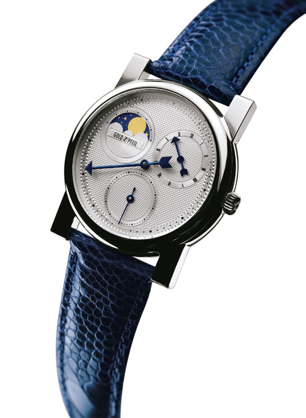 The solid silver guilloché dial and arrow hands exude the charm of yesteryear, nestling at the heart of a solid gold polished case fitted with a blue leather Goldpfeil strap. The self-winding movement seen through the back was developed by Frank Jutzi on an ETA base calibre and enables all adjustments to be made using the crown, including rapid moon-phase correction.