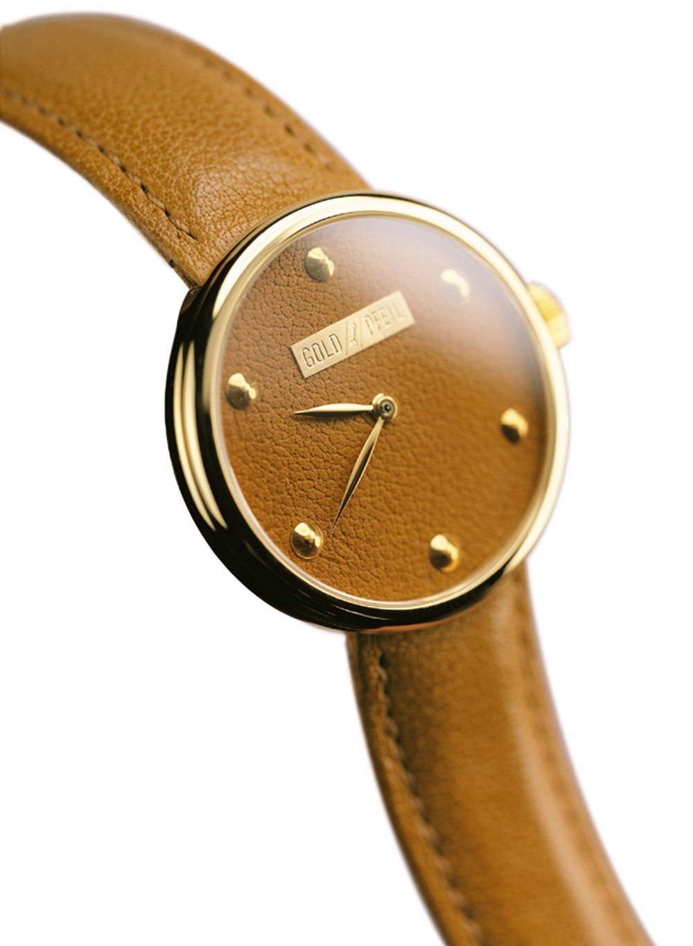 Neither very large nor very small, but slender and sensual, the most feminine of the Goldpfeil watches, signed by Antoine Preziuso, comes entirely clad in leather. This noble material takes on a warm tan colour to form the strap and dial, tracing a line that is scarcely broken by the delicate outlines of the solid gold case. Its finely grained surface is enhanced by the yellow of the gold which illuminates the feather hands, the rivet-shaped hour-markers placed at the even hours, and the brand identity cartouche.