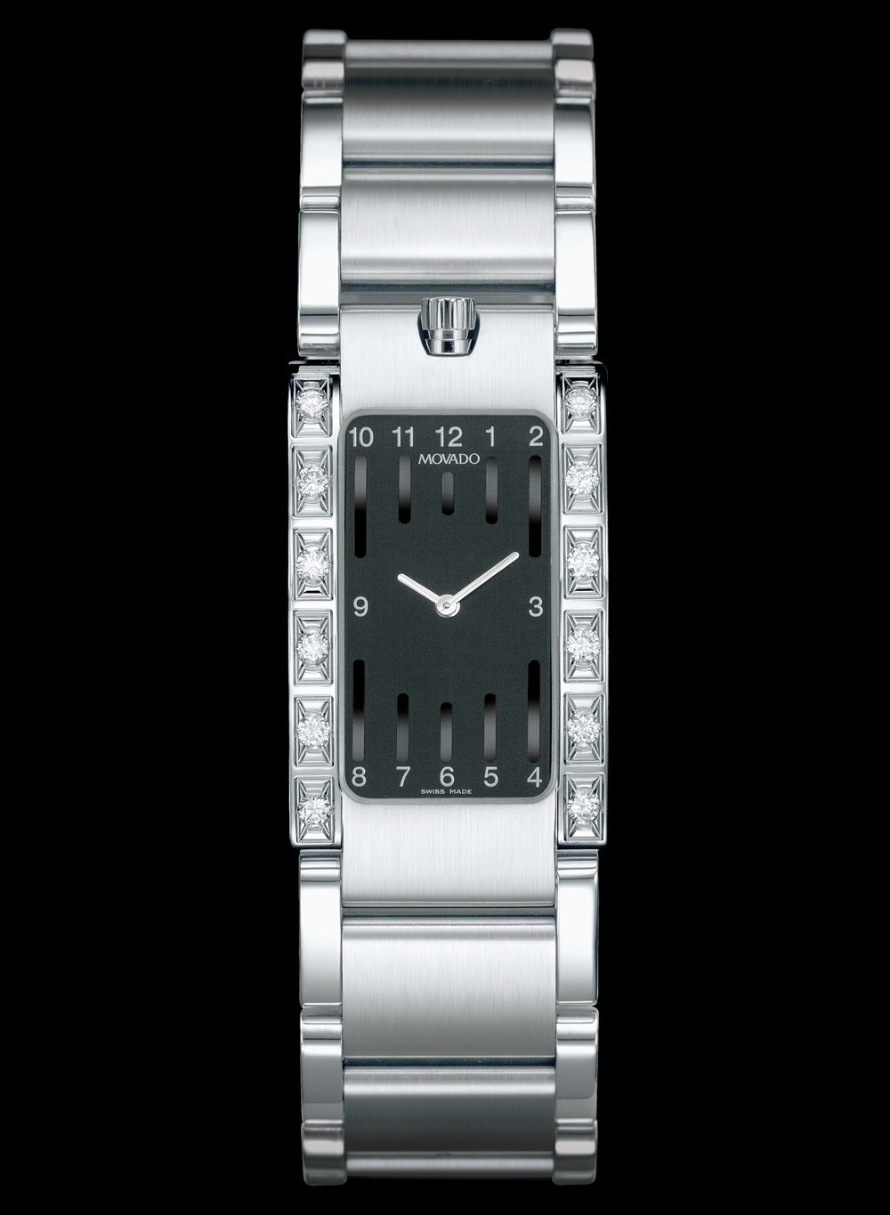 The Movado Elliptica Diamonds picks up the threads of its own history with this highly contemporary interpretation of the famous Polyplan, created in 1912. An originally-positioned crown at the top lends the case a sleek momentum over its full length. The line of diamonds provides a touch of luxury while, at the same time, highlighting the unique nature of the comma-shaped casing. An inclined rectangular dial in black, with perpendicular hour markers extending from the heart to the outer edge, adds a new dimension to this presentation of time. Movado is imposing itself on the avant-garde of watchmaking elegance!