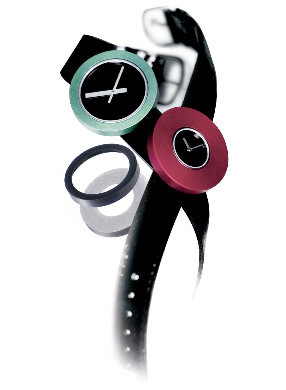 Produced entirely in Switzerland by Pierre Junod, these models have been disigned by New York graphic artists Massimo & Lella Vignelli. Each watch is sold with seven different-coloured bezels that are readily interchangeable. The cases are in steel while the bezels, in both bright and pastel colours, are of anodised aluminium.