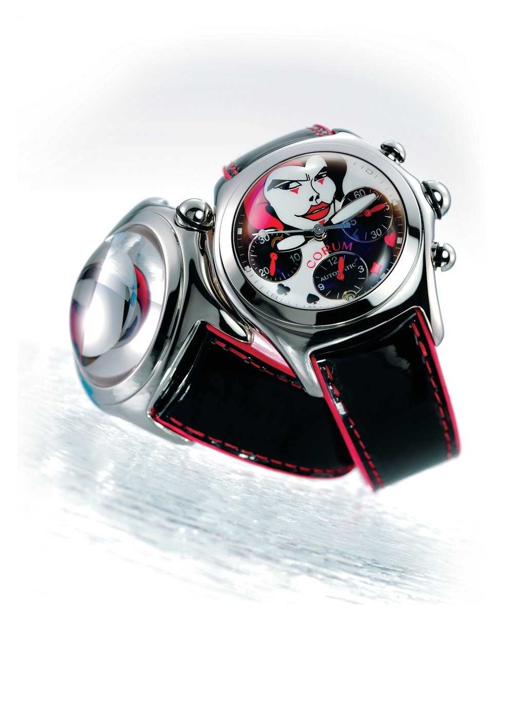The Bubble Joker constitutes the new creation in the “Collector Series”. Corum is playing a double trump card with this model, which is available in two versions - an automatic and a chronograph version - limited to 777 numbered watches. The unusual dial shows the face of a joker wearing a hat with three small bells; it highlights white, black and red alternately, taking the colours of the playing cards... A watch to really fall in love with!