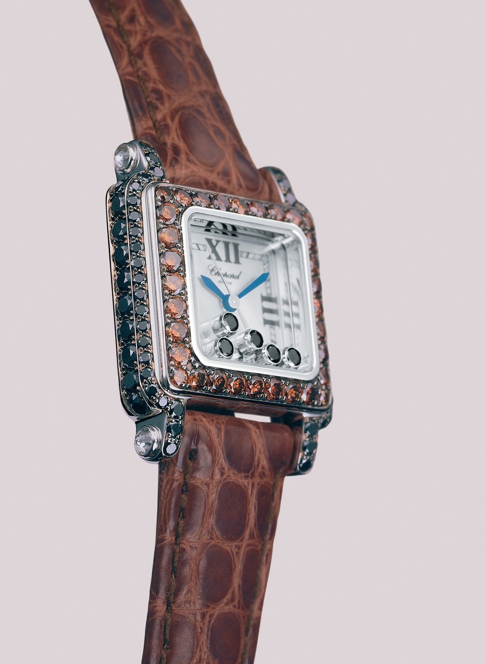Chopard is extending its “Happy Sport” collection with this elegant creation in traditional style that incorporates a case set with 56 black diamonds and 32 chocolate diamonds. The attachments and winding mechanism are set with five briolette diamonds. No one will be able to resist the luxury and sparkle of this model!