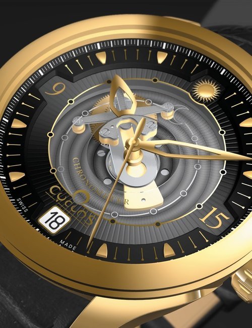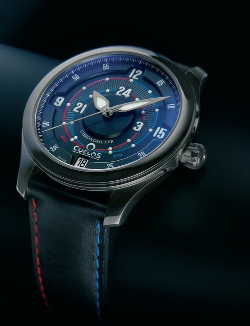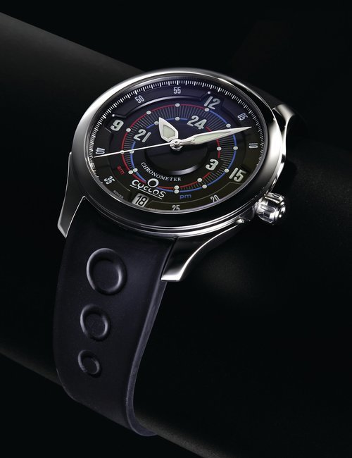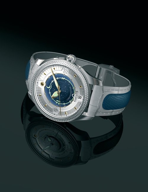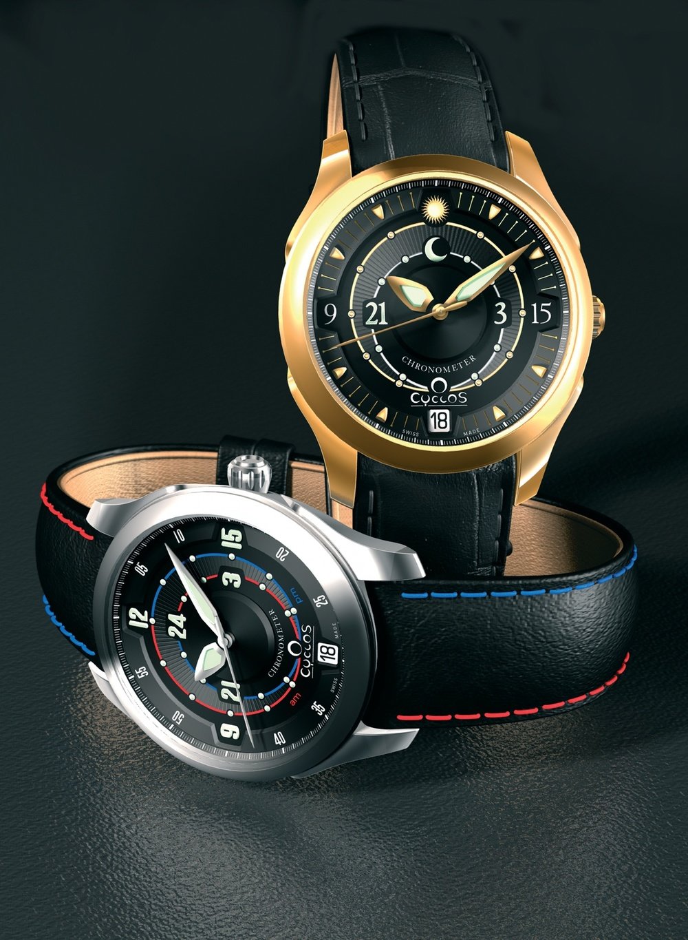 The new 24-hour Cyclos watch with a planetary movement is a classical and surprising model that has separate “a.m./p.m.” and “day and night” zones. This innovation, which has been achieved through the integration of two eccentric circles, allows the hour hand to follow the time in a highly original fashion. This it does by making a logical distinction and showing the times from midnight to 6.00 and 18.00 to 24.00 on the inner circle, and times from 6.00 to 18.00 on the outer circle. A special numbered edition (25) is available at the customer’s request.