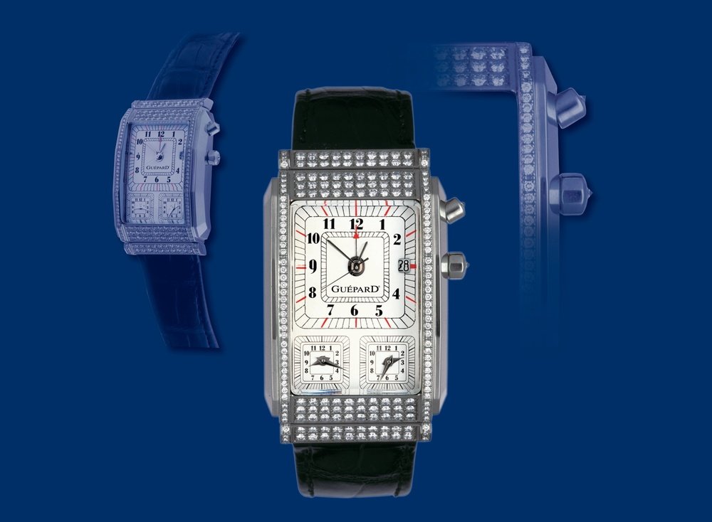 Guépard is presenting a new, exclusive model which displays three time zones thanks to three separate movements. The rectangular case in 18-carat white gold, with its highly masculine design, is embellished with 200 diamonds. The white enamel dial similarly captures the time with three square “railway” minute circles. The main movement additionally offers an alarm function, of great value for those on the move.