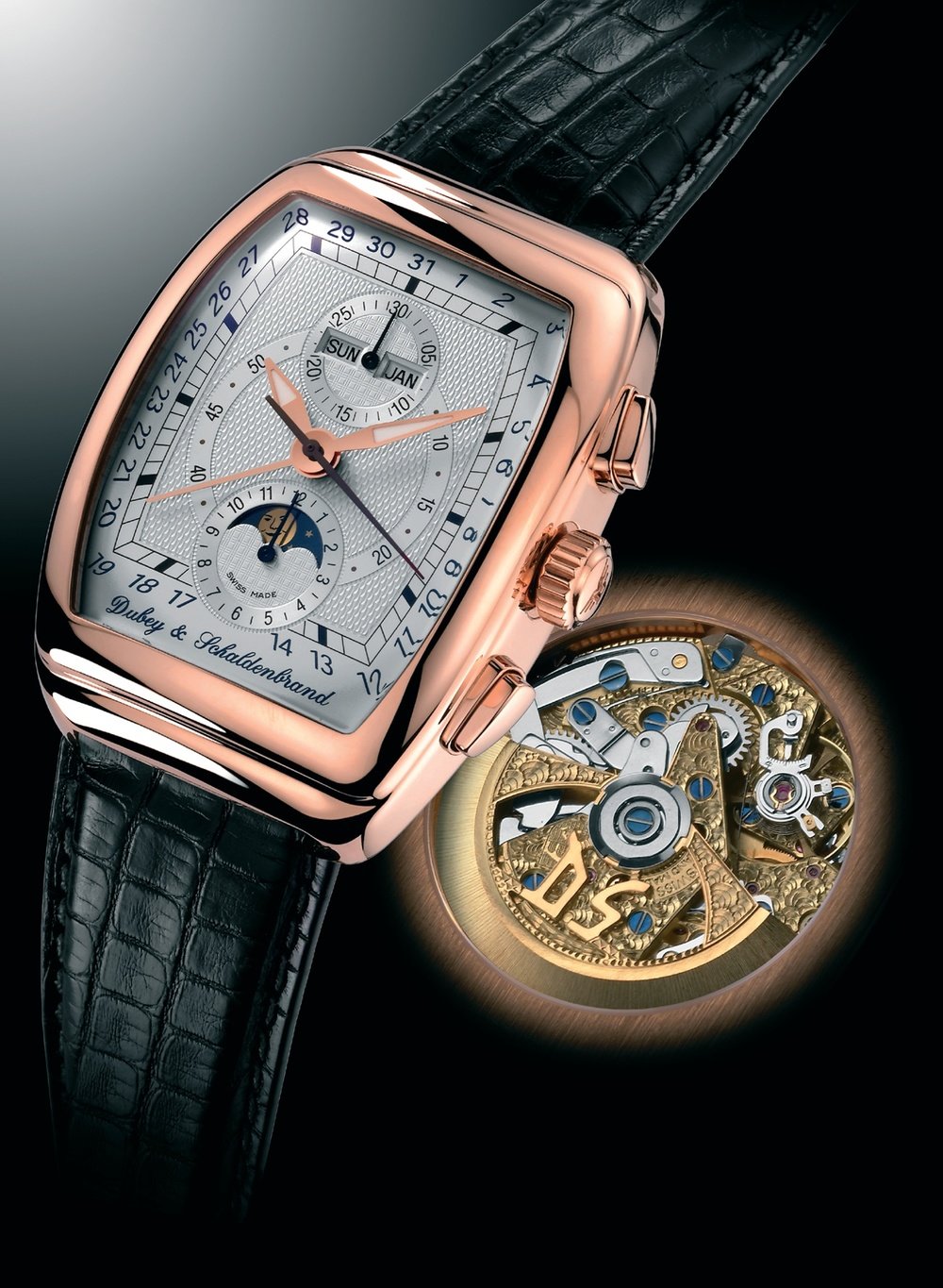This new timepiece from Dubey & Schaldenbrand certainly lives up to its name. GRAN’: the curved, barrel-shaped case, is impressively dimensioned. CHRONO: this measures the finest of records with extreme precision. ASTRO: the elegant engine-turned dial also shows the day, the date, the month and the phases of the moon. The gilt movement has been entirely hand-engraved by craftsmen from the Ponts-de-Martel valley.