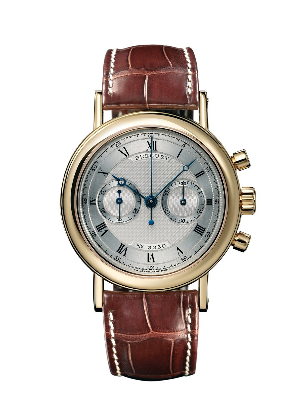 This complicated Classique watch houses a hand-wound, mechanical chronograph movement with a column-wheel device. It offers all the refinements of the Breguet style: a fluted middle section, hollow “apple” hands, an engine-turned dial, rounded and welded attachments, and screwed-on lugs.