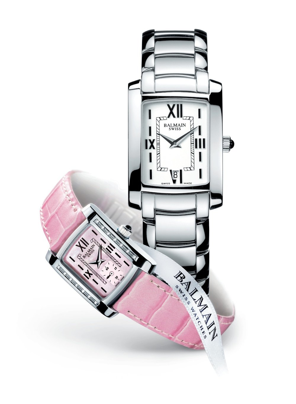 Like all the watches that bear Pierre Balmain’s signature, the Elysées model reflects both the prestige and the sophistication of this big name in haute couture. Catchword: elegance. The rectangular case in steel is of an appealing, harmonious design, while the dial boasts Roman numerals. The ladies’ model is set with 14 diamonds and has a dial in pink mother-of-pearl to match the bracelet.