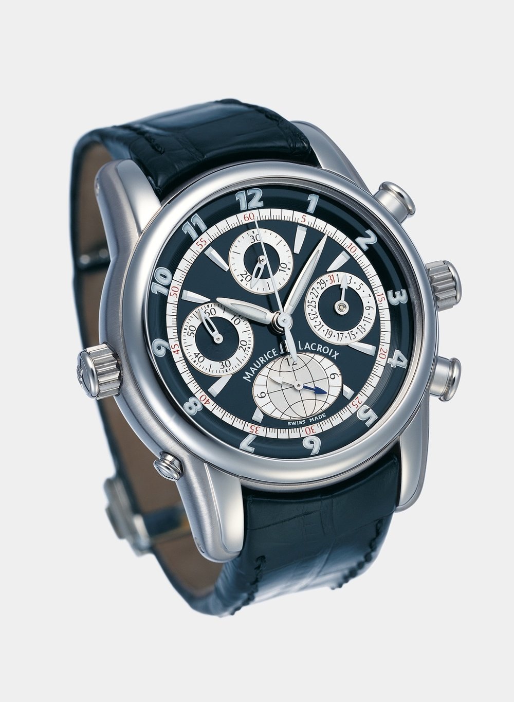 A new arrival in the Masterpiece collection, the “Chrono Globe” model is a resolutely cosmopolitan model with a sporting look at the same time. Three time zones can be displayed simultaneously - one in the centre of the dial, the second on a rotating ring around the edge and the third on a small counter in the form of a map of the world, which boasts an ingenious black and white hand to distinguish between the time during the day and the time at night.