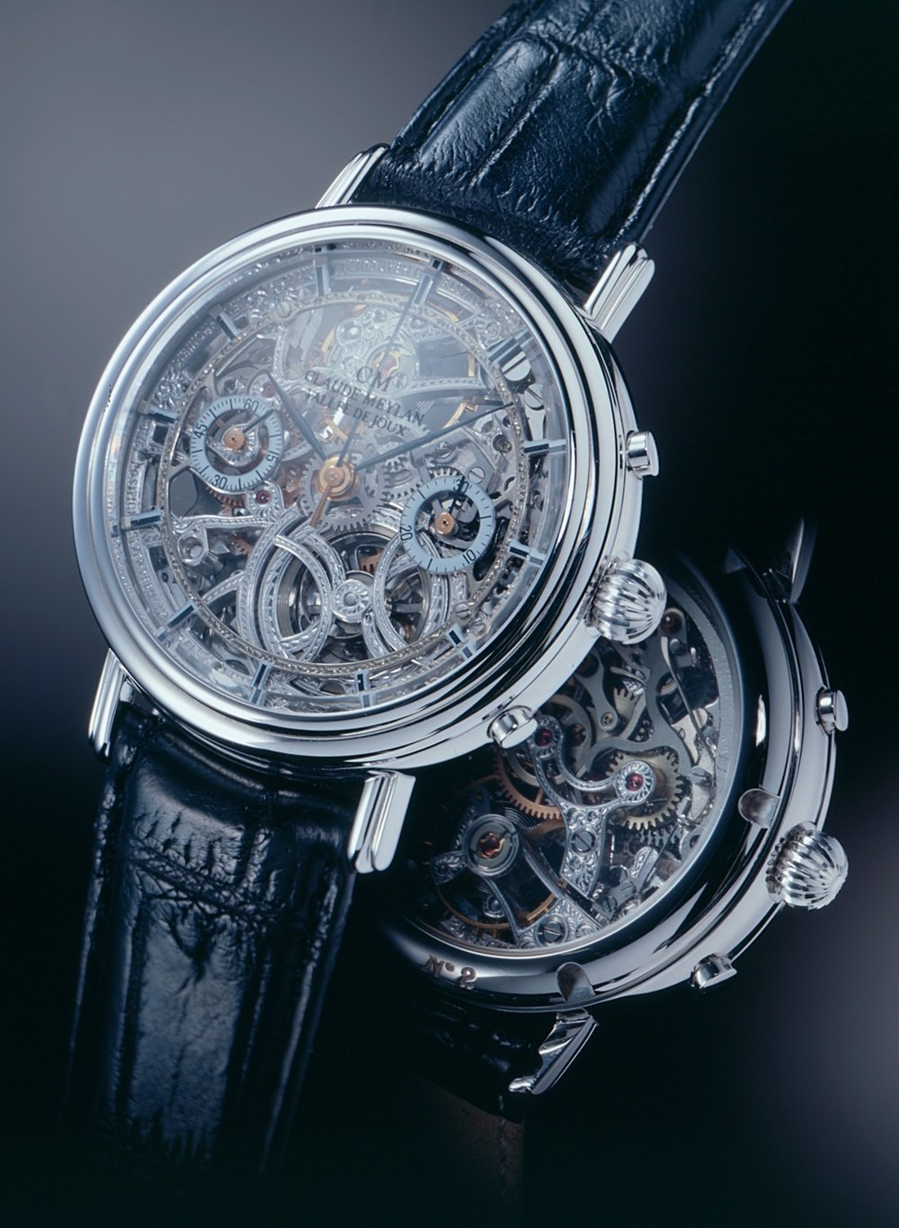 This skeleton chronograph with a transparent back offers a spectacular dive into the heart of these fine watchmaking mechanics. It is equipped with a chronograph movement dating from the Sixties, with a fully cut-away and hand-engraved column wheel. The highly sober case is in pink or white gold and the bracelet in crocodile leather.