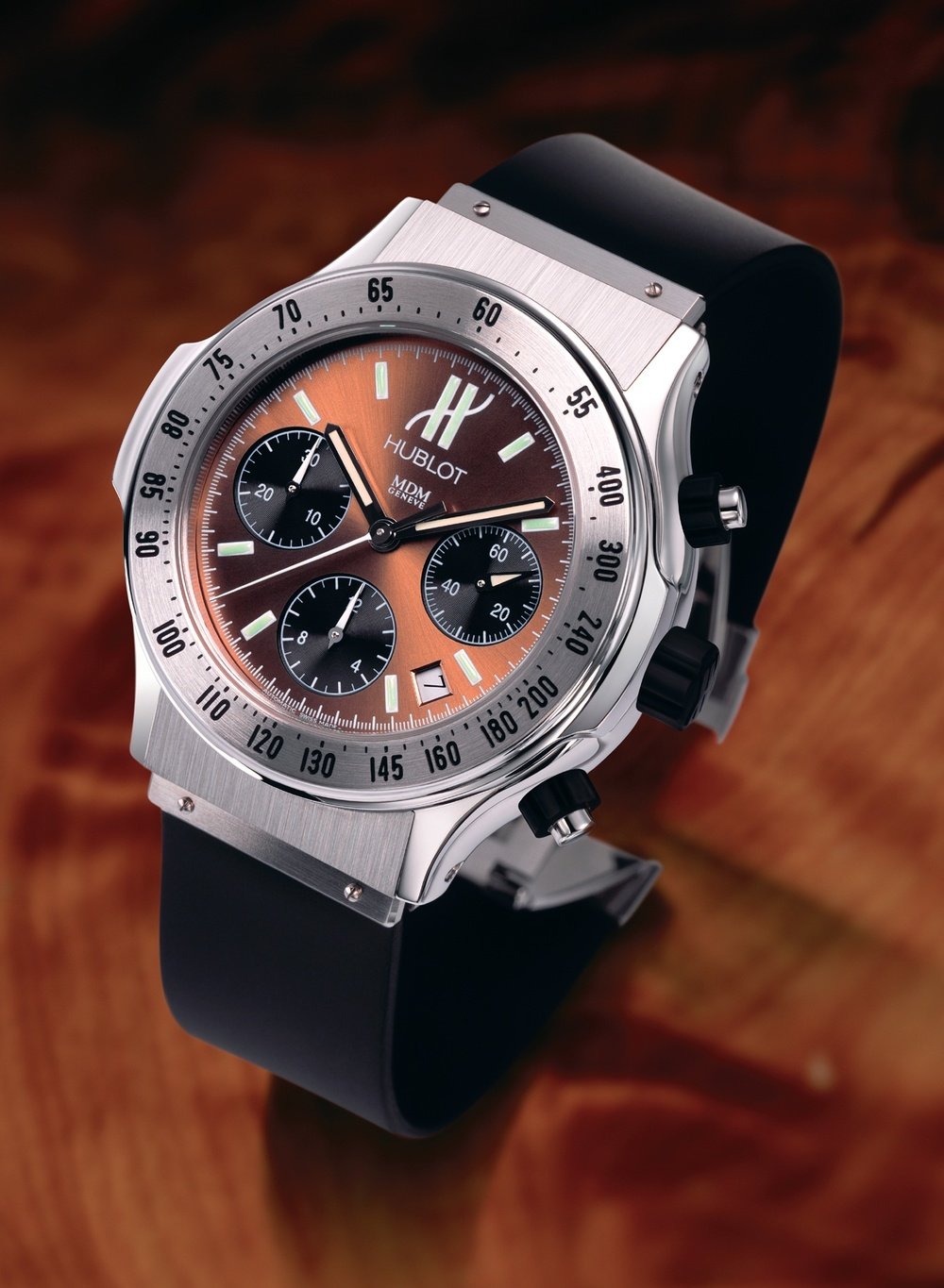Based on the Chronographe Classic, this model has ventured into oversize proportions with its widened case and bigger numerals. And size is matched by character in this case. Resolutely sporting, with its new lockable push-buttons in overmoulded rubber, this watch also marks the latest renewal of the Hublot brand. The famous black bracelet in natural rubber, and a choice of new, iridescent dials show that this impressive creation can still retain its elegance at the same time.