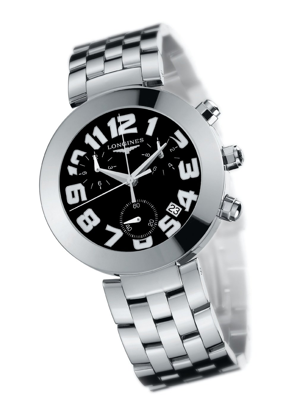 The DolceVita line from Longines has been supplemented by a round chronograph model offering resolutely masculine lines and dimensions. The case is available in either steel or 18-carat gold. The dial, boasting elegant Arabic numerals, displays short time spans to the nearest 1/10th second. Steel bracelet with a triple folding clasp.