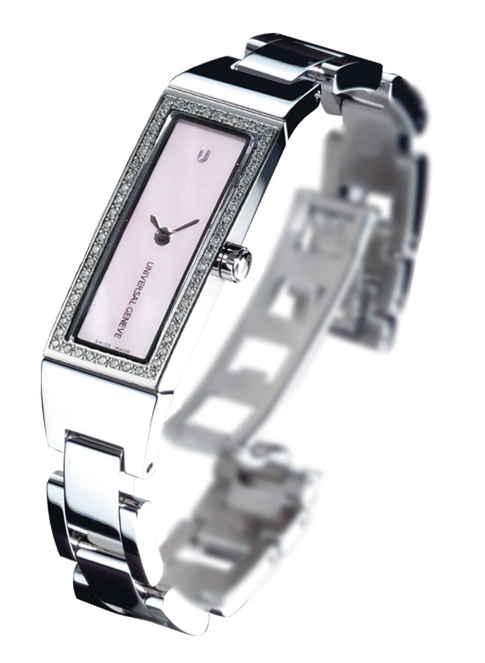 Its highly refined feminine models have long since earned Universal Genève the nickname of “watch couturier”. Today, the brand is linking up with this same tradition again by launching a cuff watch which is both simple and sophisticated at one and the same time. The case and bracelet are in polished steel. The subtle shades of the dial in pink mother-of-pearl are enhanced by the sparkle of the bezel, set with 56 diamonds.