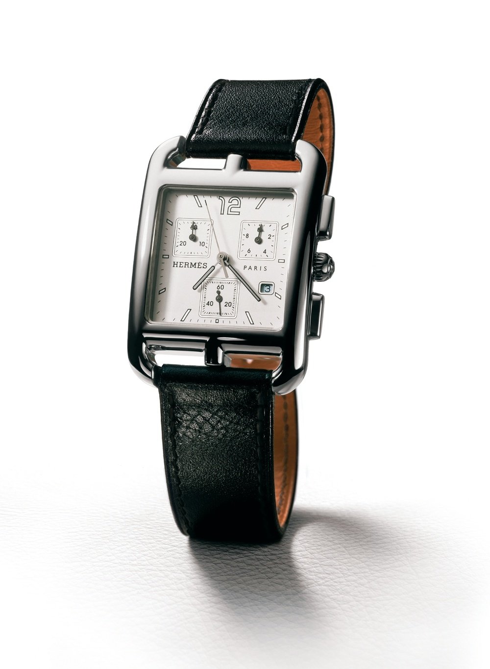 The Hermès Cape Cod line has been supplemented by a men’s chronograph which displays the time that it measures on three counters: seconds at 6 o’clock, hours at 2 o’clock and minutes at 10 o’clock. The date is displayed in a window at 4 o’clock. The three square counters echo the characteristic lines of the case. The bracelet comes in different types and colours of highly sophisticated leather.