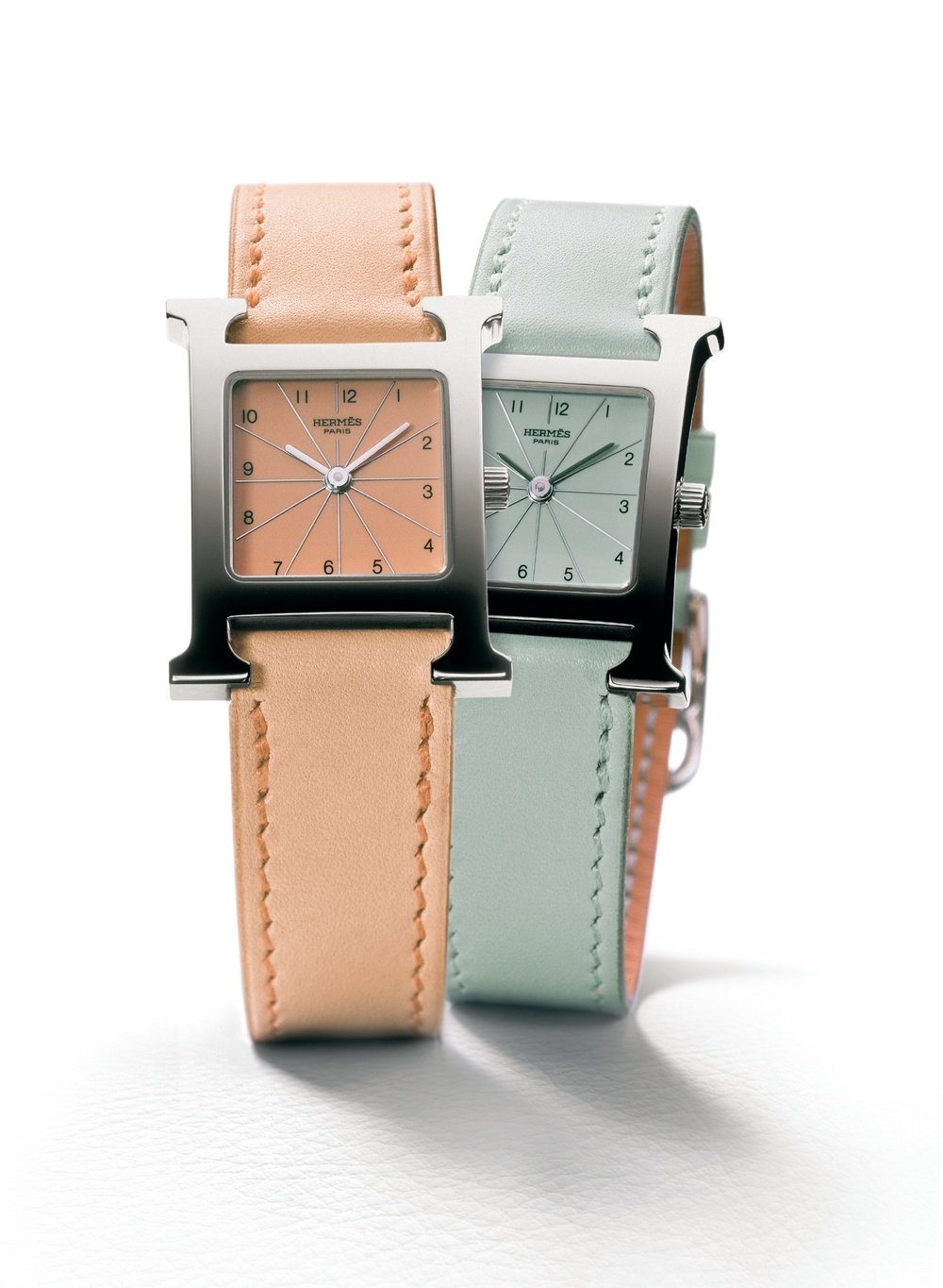 As the model that marks the symbol of the Hermès brand, the Heure H is now arrayed in pastel shades. Dials in pale green, pale blue, pale orange and pale mauve are accompanied by matching bracelets in leather, or by a bracelet of steel. The case is in steel. The pale green version has a case with 18-carat gold plating.
