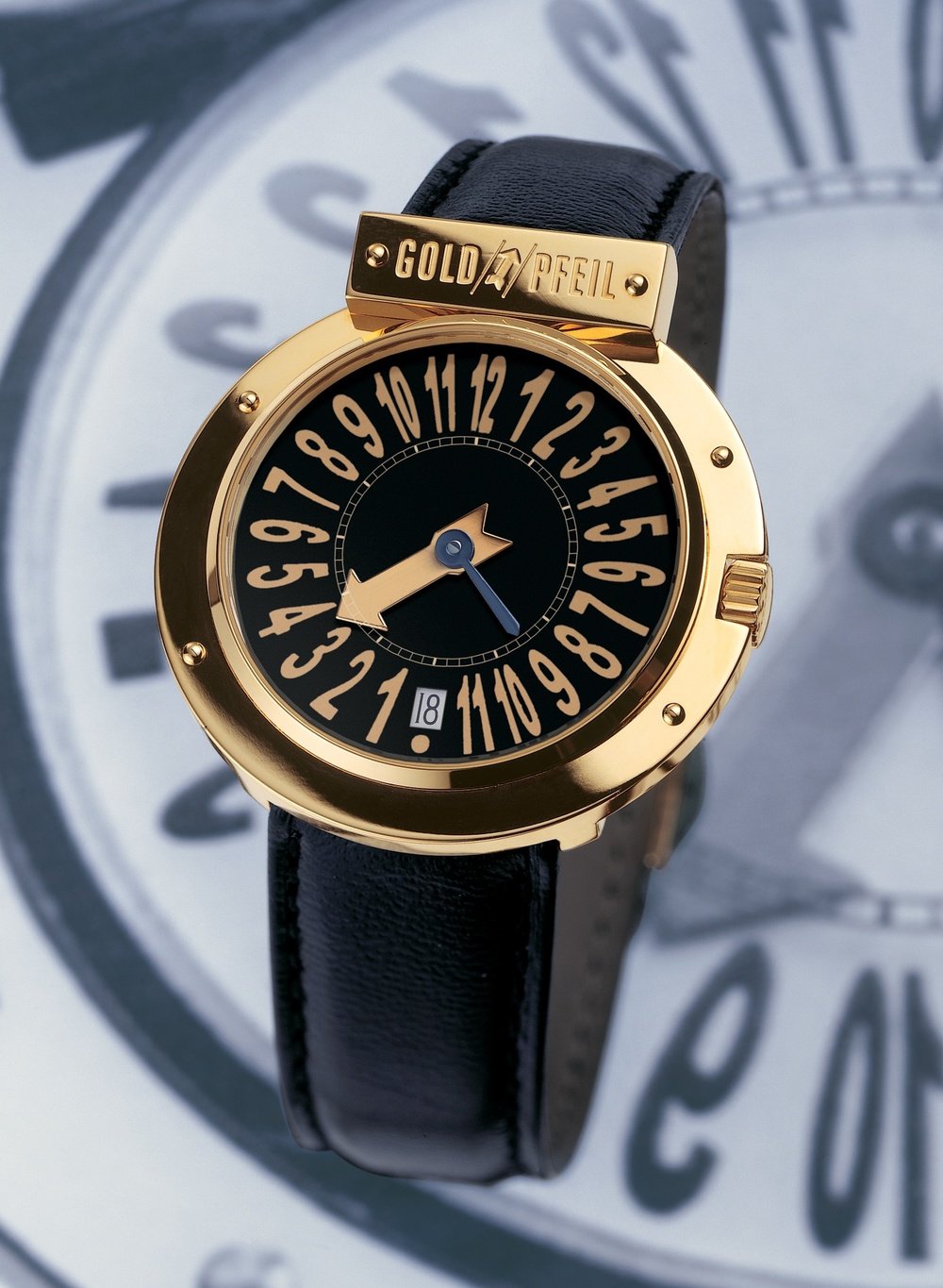 This model takes us back to the good old days of desks and leather satchels. It displays the time in a highly original fashion. The 24 hours of day and night stand out in big goldprinted Arabic numerals against the base of the black dial, which takes the form of an inclined plane. The hours are divided up by the arrow that constitutes the brand emblem. The bezel and upper bracelet attachment are fixed in place by rivets which are reminiscent of serviette clasps. The case is in yellow gold, while the oscillating weight, in gold and platinum, is visible through the sapphire base.