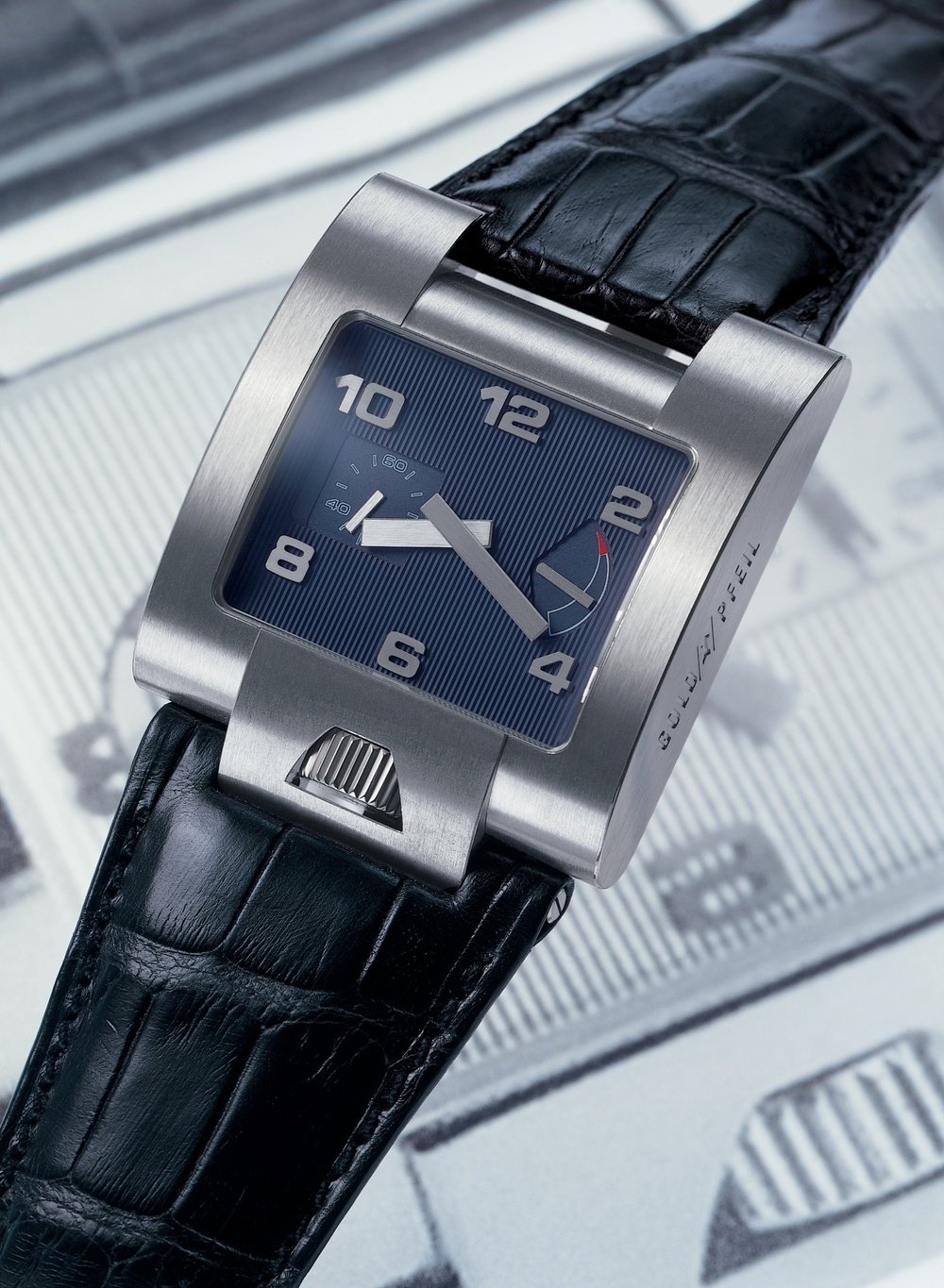 This watch has a distinctively contemporary look. The curved case in white gold, with the crown mounted at 6 o’clock, attracts attention through its original architecture. The dark blue rectangular dial, with its engine-turned decoration, boasts appliqué numerals and generously-dimensioned “baton” hands; it shows the small seconds inside a recess positioned in a rectangle at 9 o’clock while the power reserve is displayed in the arc of a circle at 3 o’clock. A certified-chronometer, hand-wound mechanical movement.