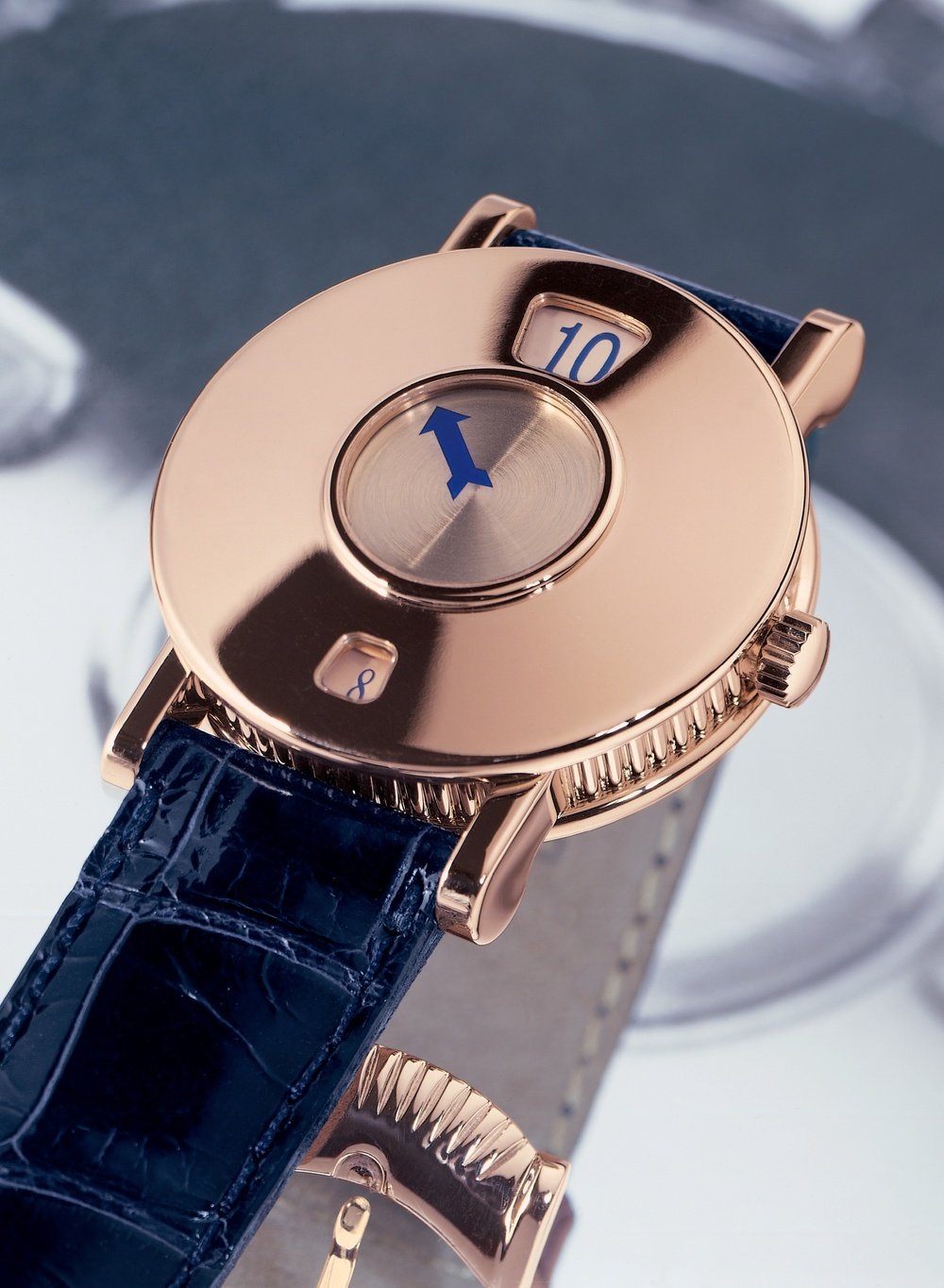This watch features a highly surprising “face”. The watchmaker has opted to open three windows in the fluted case of pink gold. The jumping hour appears in a window at 12 o’clock, while the date is visible in a window at 6 o’clock. The minutes are read off the central dial by the blue, arrow-shaped hand, which constitutes the symbol of this brand. This original presentation of the time called for the development of a particularly ingenious mechanism. The automatic movement is visible through the sapphire back.
