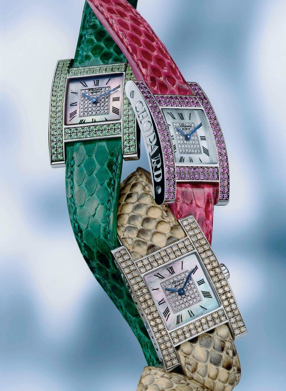 Timeless: a particularly apt name for this collection of jewellery watches with their pure and timeless form. The geometric design of the curved case in white gold is exalted by the sparkle of emeralds, pastel pink sapphires or chocolate diamonds. The dial in mother-of-pearl is set with white diamonds. The crocodile-leather bracelets blend elegantly with the colours of the stones adorning the bezel.