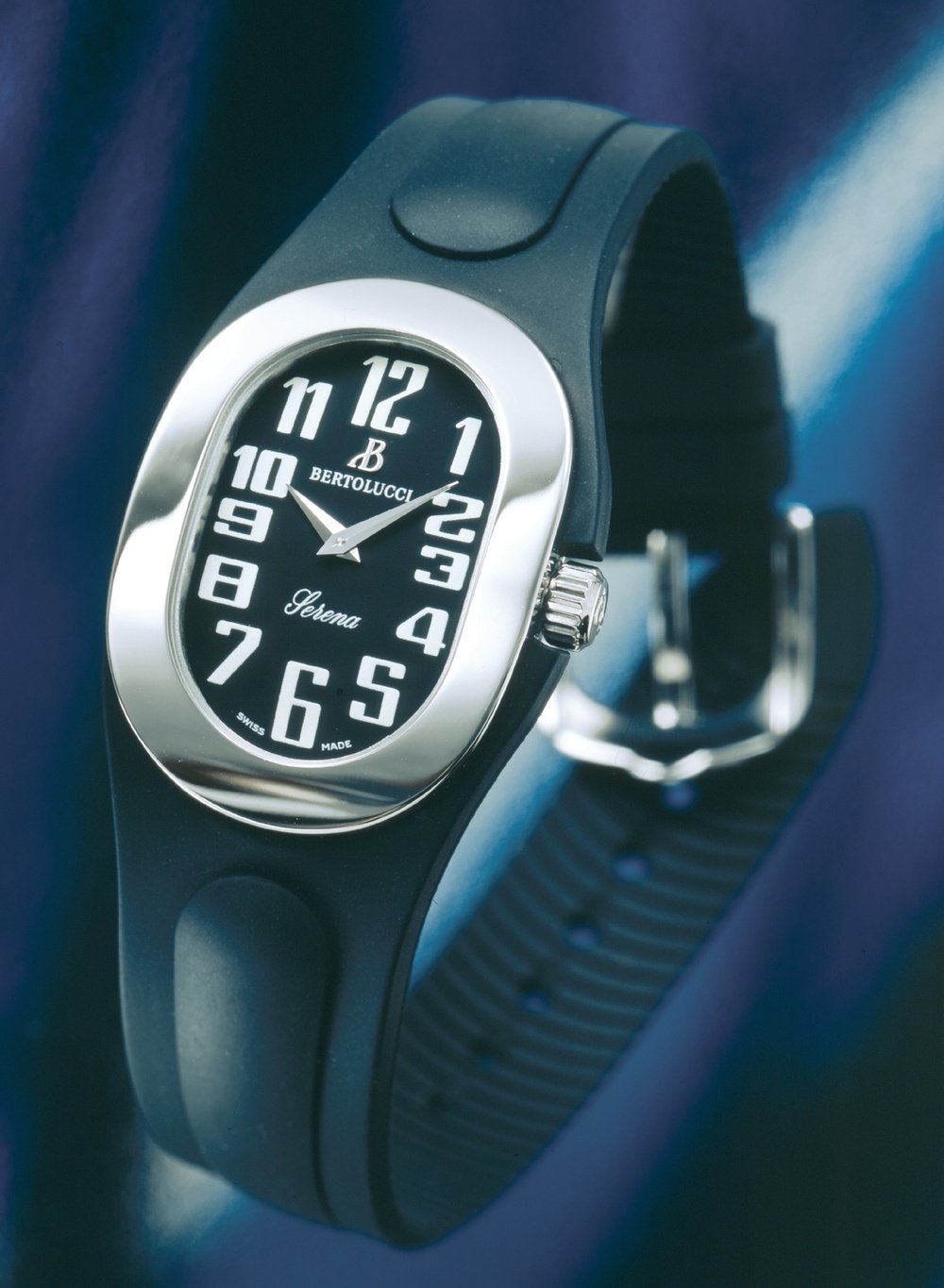The permanence of steel, the comfort of rubber: Bertolucci has added a model in a highly contemporary style to its feminine Serena line. The harmony of the curved case is enhanced by a cambered sapphire crystal. The black dial is elegantly divided up by white Arabic numerals. The bracelet of rubber, matching the dial, comes with a pronged buckle or folding clasp.