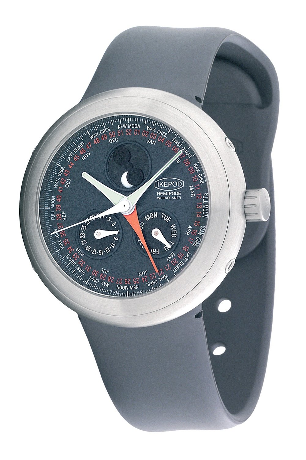 Marking the continuation of its Hemipode line, Ikepod has introduced new features on the Hemipode Weekplaner in the form of week, month and moon phase indicators. The movement is based on an ETA 2892-A2 with an additional complication by Dubois Dépraz. All models are COSC certified chronometers and are water-resistant to a depth of 50 meters. Besides hours, minutes and seconds, the watch has an additional orange hand showing the current week. The day indicator is at the 4 o’clock position, with a date indicator at 8 o’clock. The dials are available in varnished blue and grey. Each version of the dial is being produced in a limited series of 9999 in stainless steel and 999 in gold. The rubber strap comes in black, grey, brown, white, orange or lime-green, and a stainless steel bracelet and leather strap are similarly available.