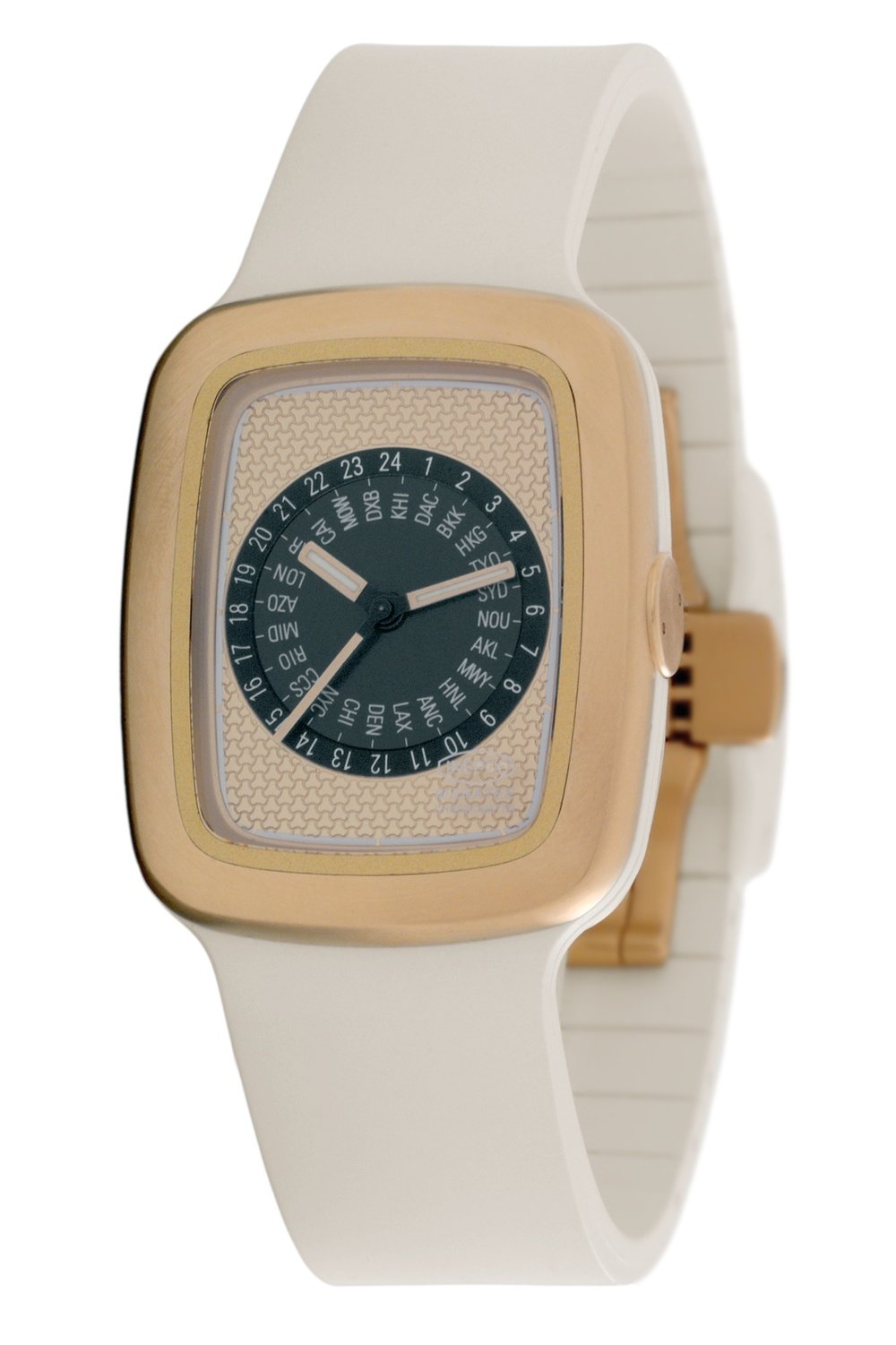 The Manatee is Ikepod’s first rectangular watch, designed for the world traveller. Ikepod has personalised the basic ETA 2893-1 movement with a turning dial that enables the wearer to read 24 time zones simultaneously. The cities on the inner dial rotate with the movement, whilst the 24 time zones are shown on the outer dial. The rubber strap runs through the entire watch and features a clasp closure mechanism. The case is water-resistant to a depth of 50 meters. And the back of the watch bears a plastic medallion symbolising a manatee - the animal that has given its name to this model. As a certified chronometer (COSC), the Manatee Gold is limited to 999 models of each dial version.