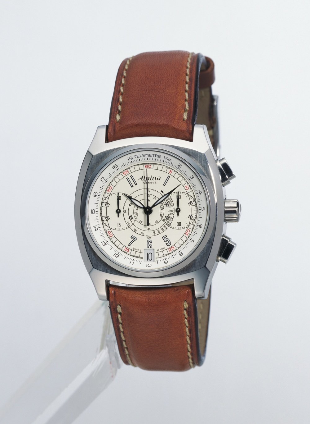 A brand dating back more than a hundred years, Alpina is now moving back into the forefront again with its new, contemporary-design Startimer collection. This chronograph confirms the current trend towards big-diameter cases. The dial boasts original details: big Arabic numerals, vertically-aligned counters, a tachometric scale and a play on colours. A crown at 10 o’clock activates a day/night 24-hour display, while a supplementary hand shows a second time zone.