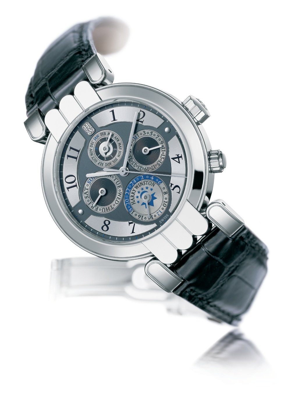 To immortalise the art of watchmaking that goes into its Premier collection, Harry Winston has combined two complications in this perpetual calendar, which is programmed up to 28 February 2100. The second time zone can be read off at 6 o’clock from a two-tone 24-hour night/day counter. This timepiece, with its sophisticated design, is available in a limited edition of 100 watches. The hand-engraved platinum rotor with its Côtes de Genève decoration can be admired through the sapphire back.