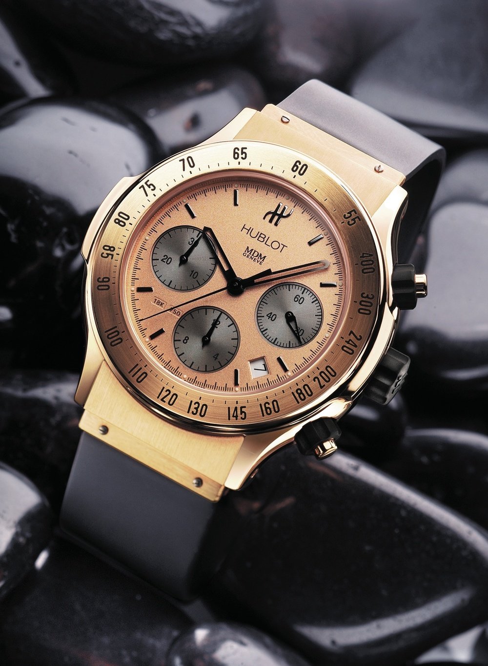 The “Chrono SuperB”, Hublot’s sporting line, is refined with pink gold in this limited edition of 100 watches with a finely-stippled gold dial. The precious metal contrasts boldly with the overall black-rubber look of this highly contemporary creation. A splendid alliance of Italian design and Swiss watchmaking technology.