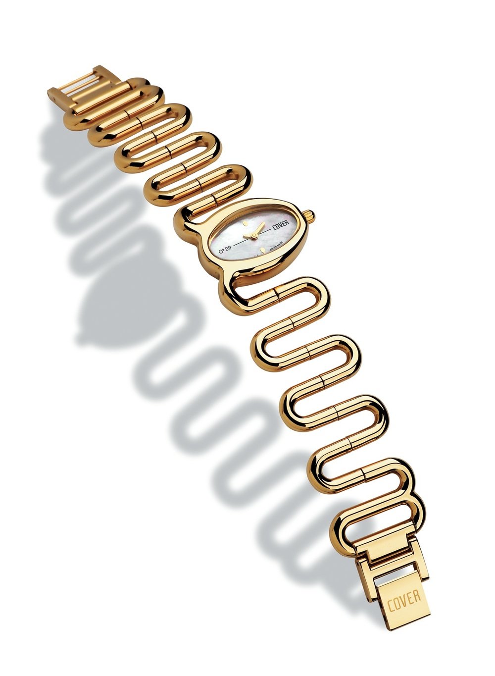 The central model of the Expressions collection, this watch exudes elegance and extravagance at one and the same time, attracting attention through its “snake” bracelet in gold-plated steel and mother-of-pearl dial which comes in four colours. The new face of temptation, signed by Cover.