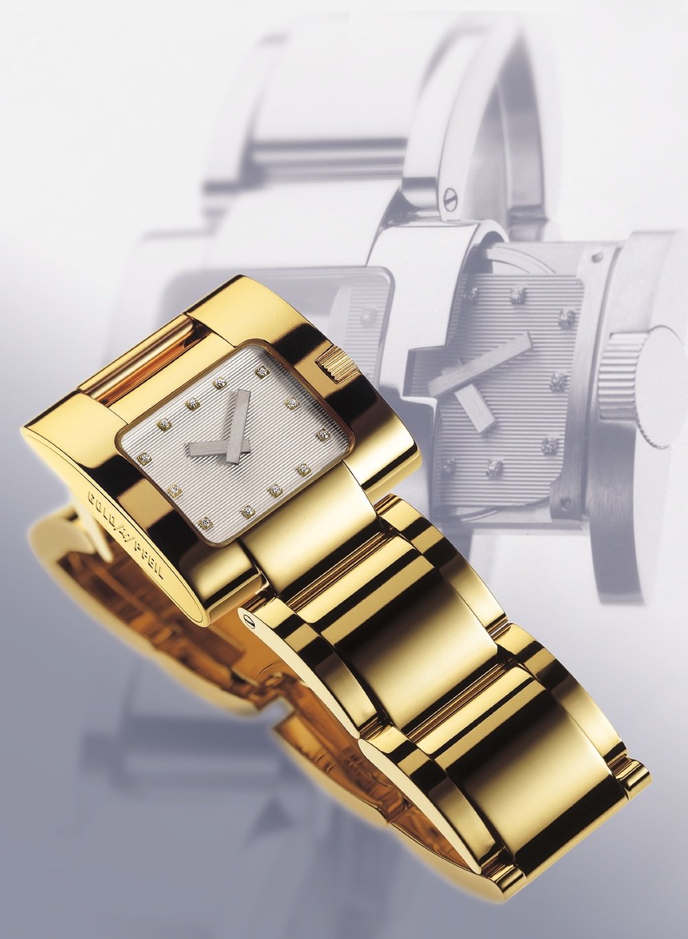 Purified perfection, this model created by Thomas Baumgartner has a patented fitting system which allows the movement to be “slid” into the case from the side. The finely engine-turned dial in solid silver is divided up by 12 diamond hour markers. The embedded crown emphasises the sobriety of the design. The original architecture of the curved case is echoed by the links of the bracelet in yellow gold. An up-to-the-minute jewel for ladies who like to be ahead of the times when it comes to fashion trends.