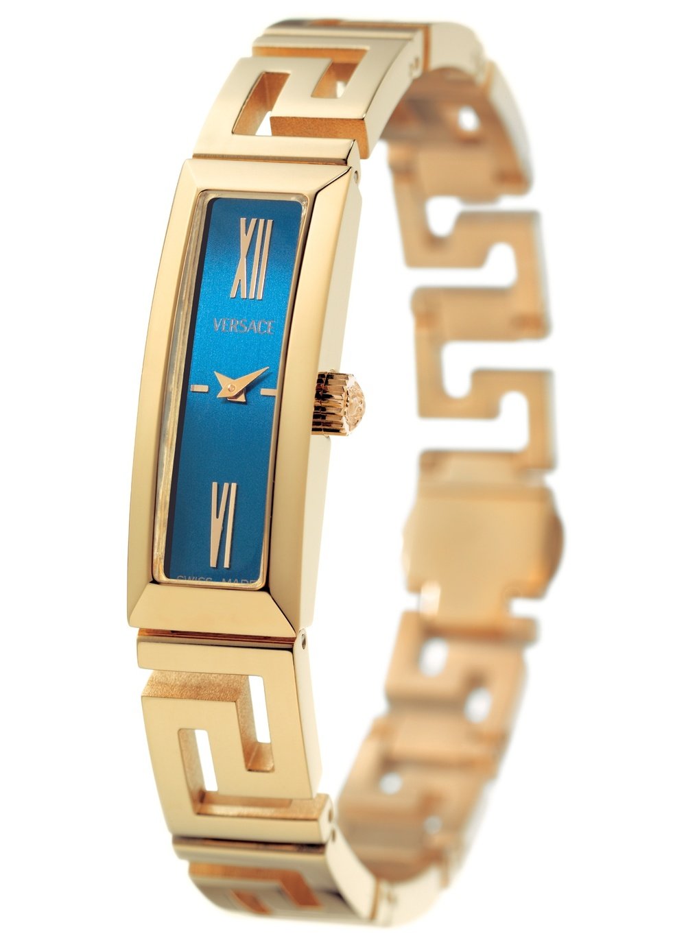 This feminine creation bearing the Versace signature honours two of the brand’s favourite icons: a Greek fret on the bracelet and a Medusa’s head on the crown. The rectangular case lines up perfectly on the links to form a semi-rigid bracelet. The sober blue dial is magnificently set off by the polished or gold-plated steel.