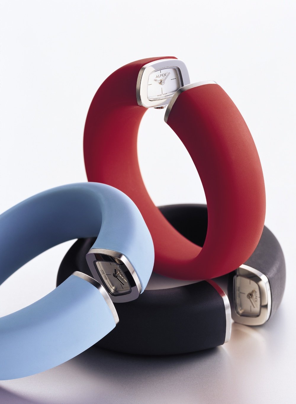 Young designer Maren Krämer has come up with this surprising and up-to-the-minute model for Alfex. The pop-art-style bracelet is in a new type of extremely supple and comfortable rubber. The time is read off a mirror in polished steel on to which it is reflected from the dial at the other end of the bracelet.