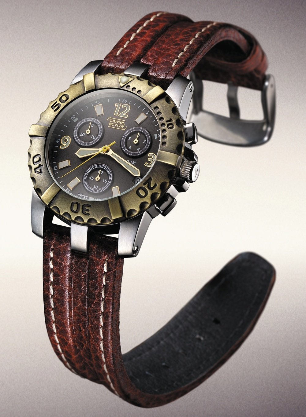 Camel Active is presenting the spirit of adventure and passion of wide open spaces in a new chronograph with a robust and sporting look. The bronze-coloured bezel teams up harmoniously with the bracelet in brown leather. The case, which is 40 mm in diameter, is equipped with a triple safety crown.