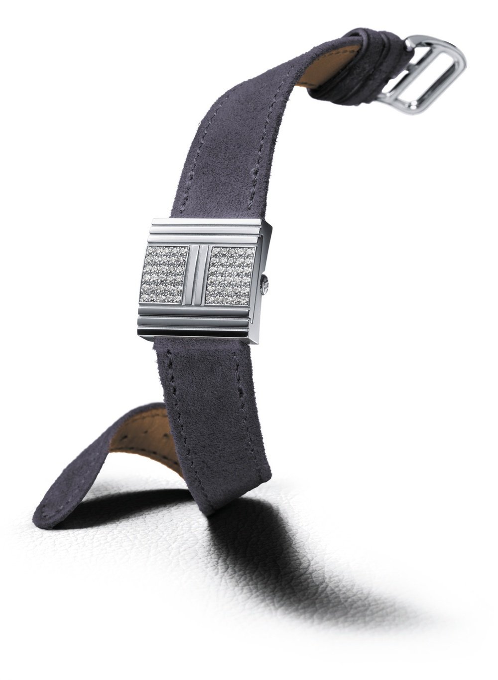 This new creation from Hermès ranks among the so-called “mysterious” watches. The dial is concealed by a cover which slides to the left when pressure is applied by the finger. The H-shaped motif engraved on the cover evokes the padlock on the famous Kelly bag. Exceedingly precious, this watch comes with delightfully coloured bracelets and sparkles a thousand times over.