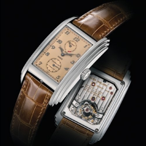 Refined and original, the new masterpiece from this Geneva Manufacture combines two complications which would generally require a great deal of space: a double barrel as a series feature, guaranteeing a 10-day power reserve and a tourbillon rotating around its own axis in one minute behind the transparent back. The movement is made up of 231 parts, 72 of which are for the tourbillon. It comes in a rectangular case in art deco style with a waisted profile and flanks with triple fluting. The dial incorporates small seconds at 6 o’clock and the power reserve at 12 o’clock.