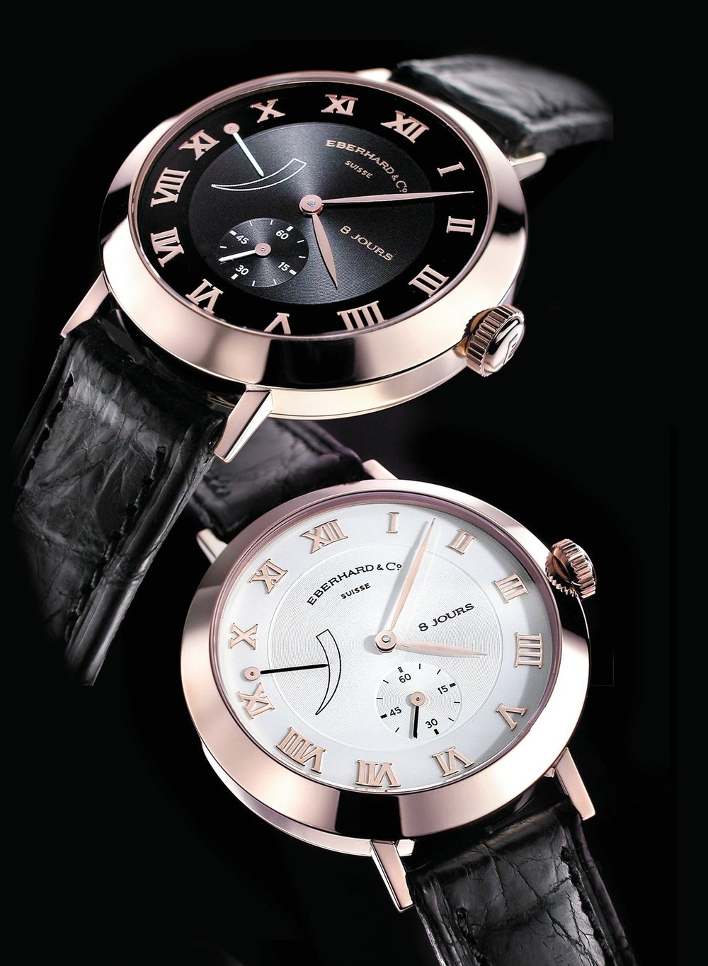 Continuing in the Eberhard & Co tradition of fine watches, the “8 jours” collection has been extended by a highly elegant model in pink gold. The special winding mechanism guarantees an eight-day power reserve, harmoniously displayed on the stylised dial.