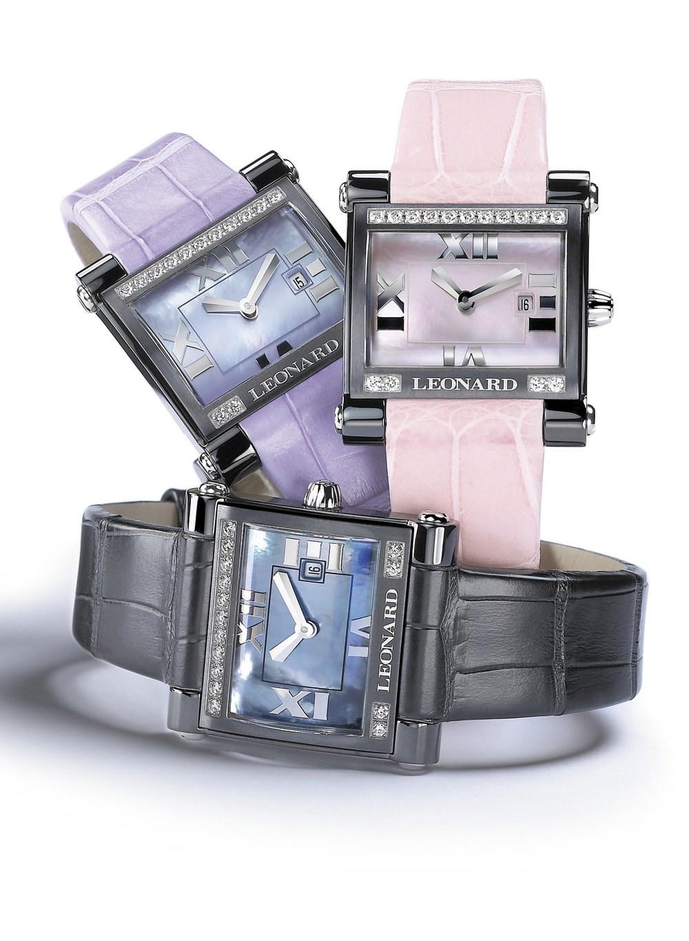 Leonard has married diamonds with black steel in a bold move. This novel combination highlights the design of the rectangular case, providing an elegant contrast to the colours of the bracelet and dial. The exclusive, faceted diamond hands add a distinctive touch to this enticing model.