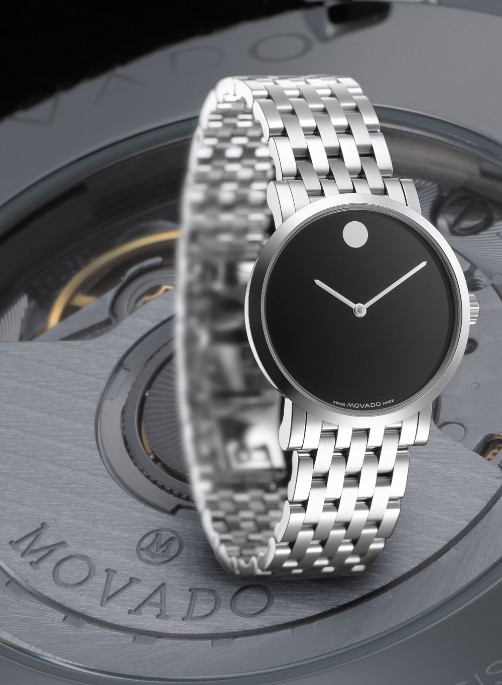 Movado is launching the Museum Automatic, a modern and refined version of one of watchmaking’s most famous designs. The round hour marker, symbolising the sun at its zenith, stands out against a shiny black dial devoid of numerals and hour markers. The automatic movement and its elegant Côtes de Genève decoration can be admired through a sapphire back.